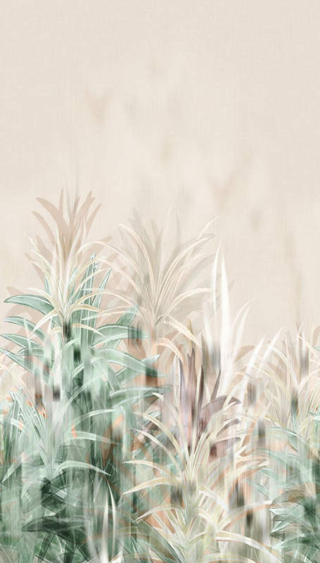 Dit behang heeft een stijlvol, tropisch geïnspireerd plantenmotief dat subtiel is geplaatst in het onderste deel van het dessin. De bladeren zijn uitgevoerd in zachte tinten zoals mintgroen, saliegroen en beige, met een licht aquarelachtig effect. Fijne witte en lichtgele lijnen zorgen voor verfijnde details. De warme beige achtergrond met een linnenachtige textuur geeft het behang een rustige en natuurlijke uitstraling. Het geheel oogt modern, luchtig en elegant, en creëert een ontspannen sfeer in elke ruimte.