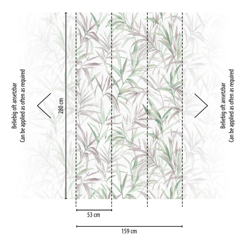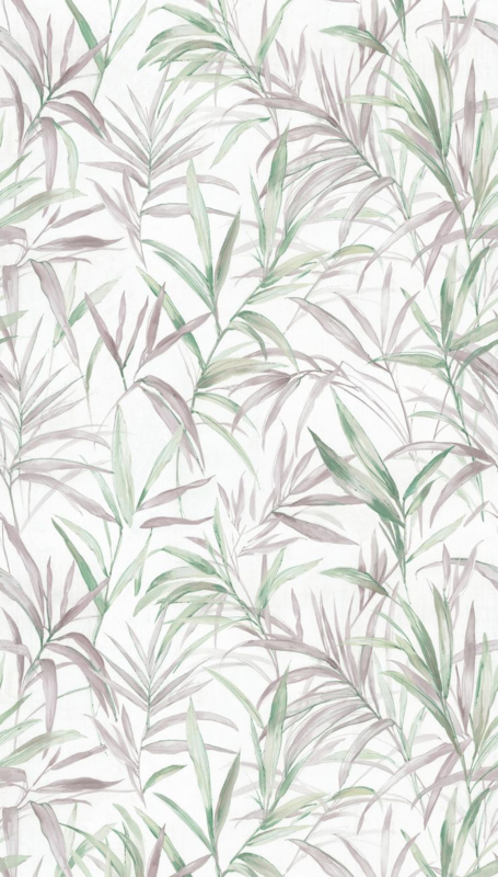 Dit behang is voorzien van fijne palmbladeren die in een zachte aquarelstijl over een lichte, bijna witte achtergrond lopen. De slanke, vloeiende lijnen geven het dessin een luchtige en elegante uitstraling. Het kleurgebruik bestaat uit lichte groentinten, gecombineerd met subtiele accenten van pastel lila en violetgrijs. Deze harmonieuze kleurencombinatie zorgt voor een frisse, rustige sfeer met een natuurlijke touch. Het botanische ontwerp voelt modern aan, maar heeft ook een tijdloos karakter dat doet denken aan klassieke natuurillustraties. Perfect voor interieurs waarin lichtheid, rust en verfijning centraal staan.