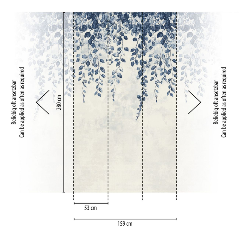 Dit behang heeft een verfijnd botanisch dessin in een zachte aquarelstijl. Rijk gevulde takken met gedetailleerde bladeren in verschillende blauwtinten hangen sierlijk naar beneden en creëren een elegant, watervalachtig effect. De bladeren hebben een handgeschilderde uitstraling met fijne lijnen en vloeiende kleurovergangen, wat zorgt voor een natuurlijke en artistieke sfeer. Naar de onderzijde toe loopt het patroon subtiel over in een lichte, wolkachtige achtergrond van zacht wit en zeer lichte blauwnuances. Het diepe indigoblauw van de bladeren vormt een mooi contrast met de rustige, heldere basis en geeft het behang een luchtige, bijna zwevende uitstraling. Het geheel straalt frisheid, rust en verfijnde elegantie uit.