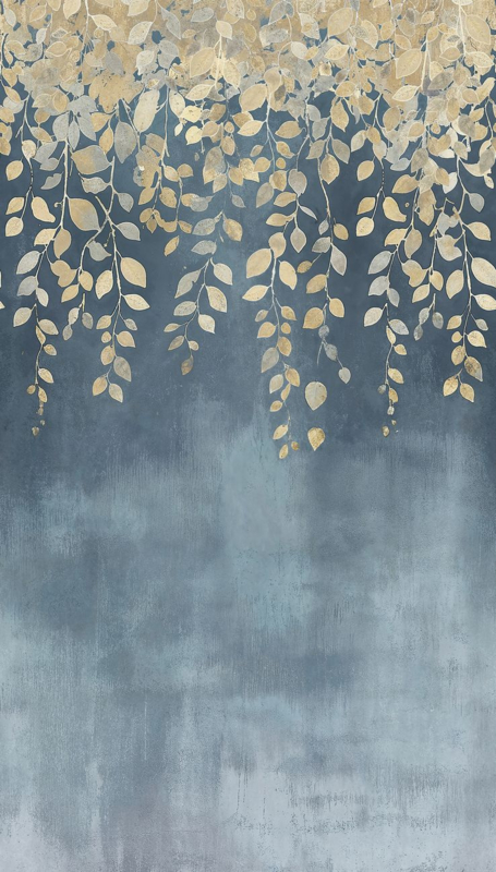 Dit behangpapier is versierd met fijne, goudkleurige bladeren die sierlijk van boven naar beneden lijken te vallen, als een elegante waterval van takken en twijgen. De bladeren variëren subtiel in vorm en tint, wat het dessin een natuurlijke en verfijnde uitstraling geeft. De achtergrond bestaat uit een zacht kleurverloop van diepe blauwtinten naar lichtere, nevelige nuances van lichtblauw en grijs. Het licht gestructureerde, schilderachtige oppervlak doet denken aan aquarel- of spateltechniek en versterkt het artistieke karakter van het ontwerp. De combinatie van koele, matte blauwtinten met de warme glans van goud creëert een rustige maar luxueuze sfeer. Het geheel oogt elegant en dromerig, en is perfect voor interieurs waarin comfort en verfijning samenkomen.