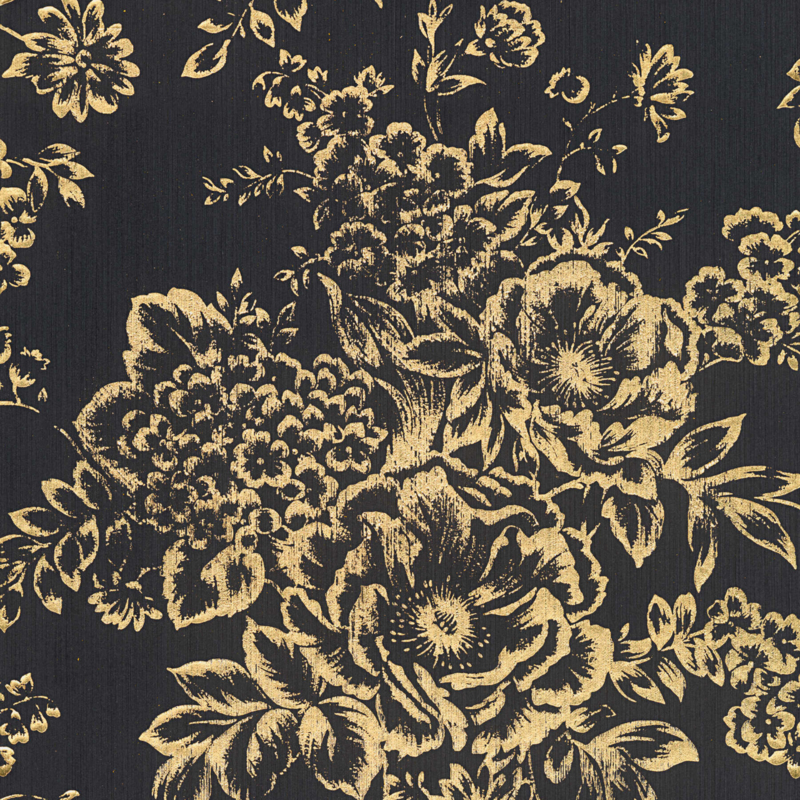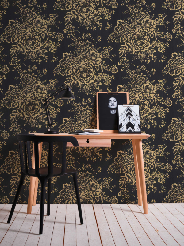 EXCLUSIEF BEHANG TEXTIELLOOK GOUD ZWART BLOEMEN KLASSIEK 30657-7